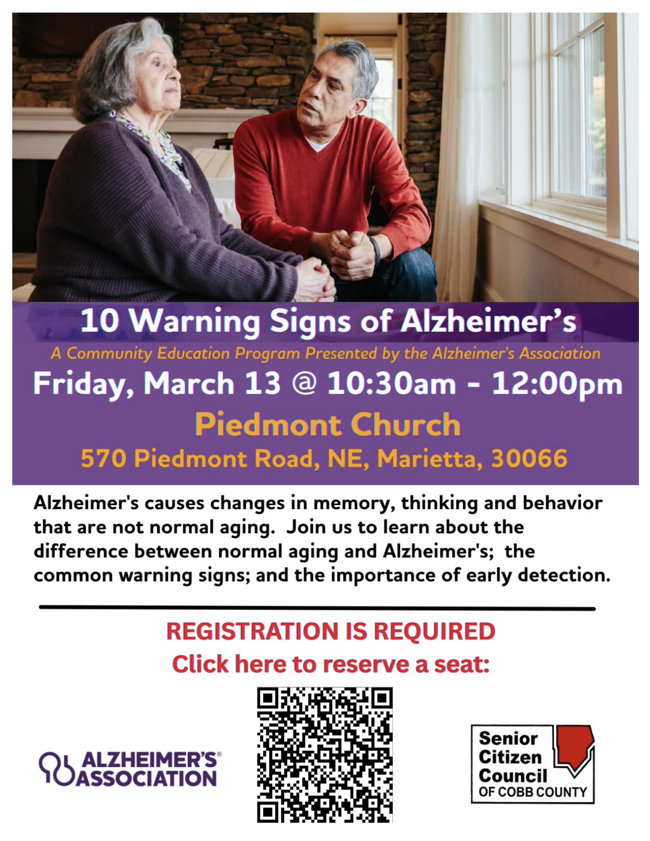 Our next meeting and seminar will include a short business meeting to elect the next Board of Directors for 2026/2027 and a seminar on the 10 warning signs of Alzheimer's. See more information below.